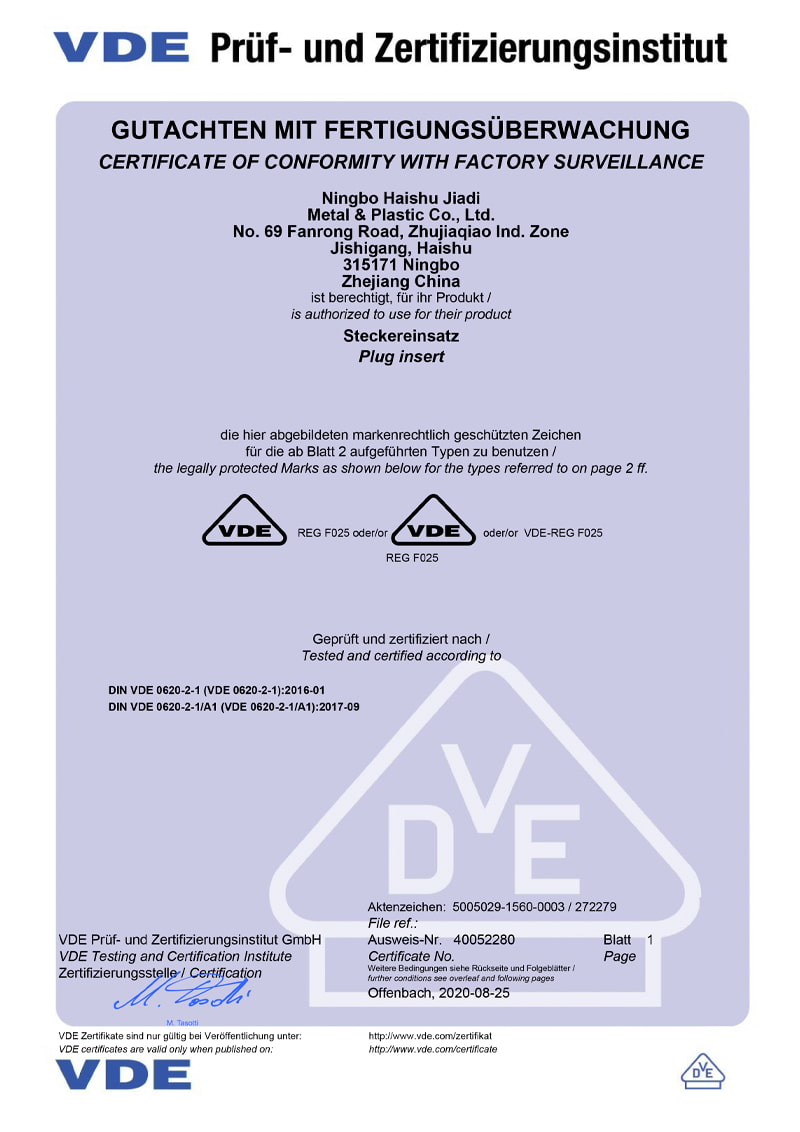 Kami memperoleh pensijilan sistem pengurusan kualiti ISO 9001 pada tahun 2005, pensijilan VDE pada tahun 2015, pensijilan sistem pengurusan alam sekitar ISO 14001 dan pensijilan bilah palam UL pada tahun 2019. Kami sentiasa mematuhi prinsip " Inovasi Berterusan, kualiti diutamakan, perkhidmatan ikhlas, pelanggan fokus". Sangat mengalu-alukan pelanggan domestik dan asing untuk kerjasama perniagaan.
